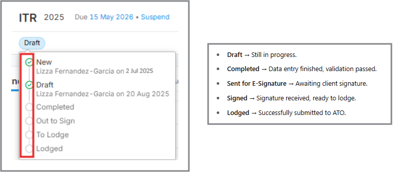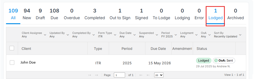 - When sending to ATO, status is Lodging while waiting for confirmation. Learn more here