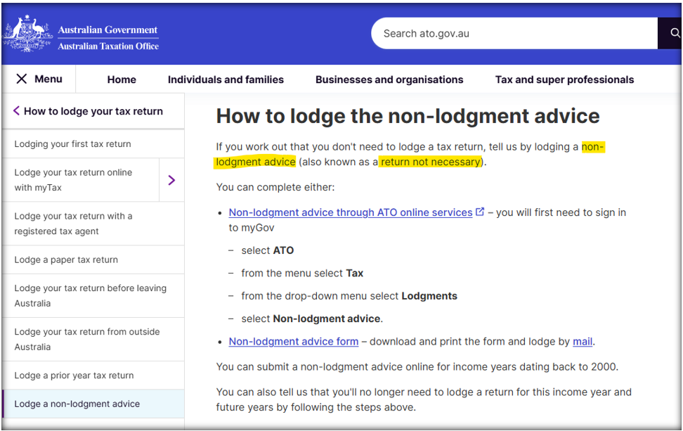 ATO related link: https://www.ato.gov.au/individuals-and-families/your-tax-return/how-to-lodge-your-tax-return/lodge-a-non-lodgment-advice