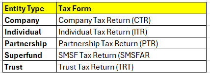 - Here is the list of tax corresponding tax forms that can generated for each Entity Type chosen:
