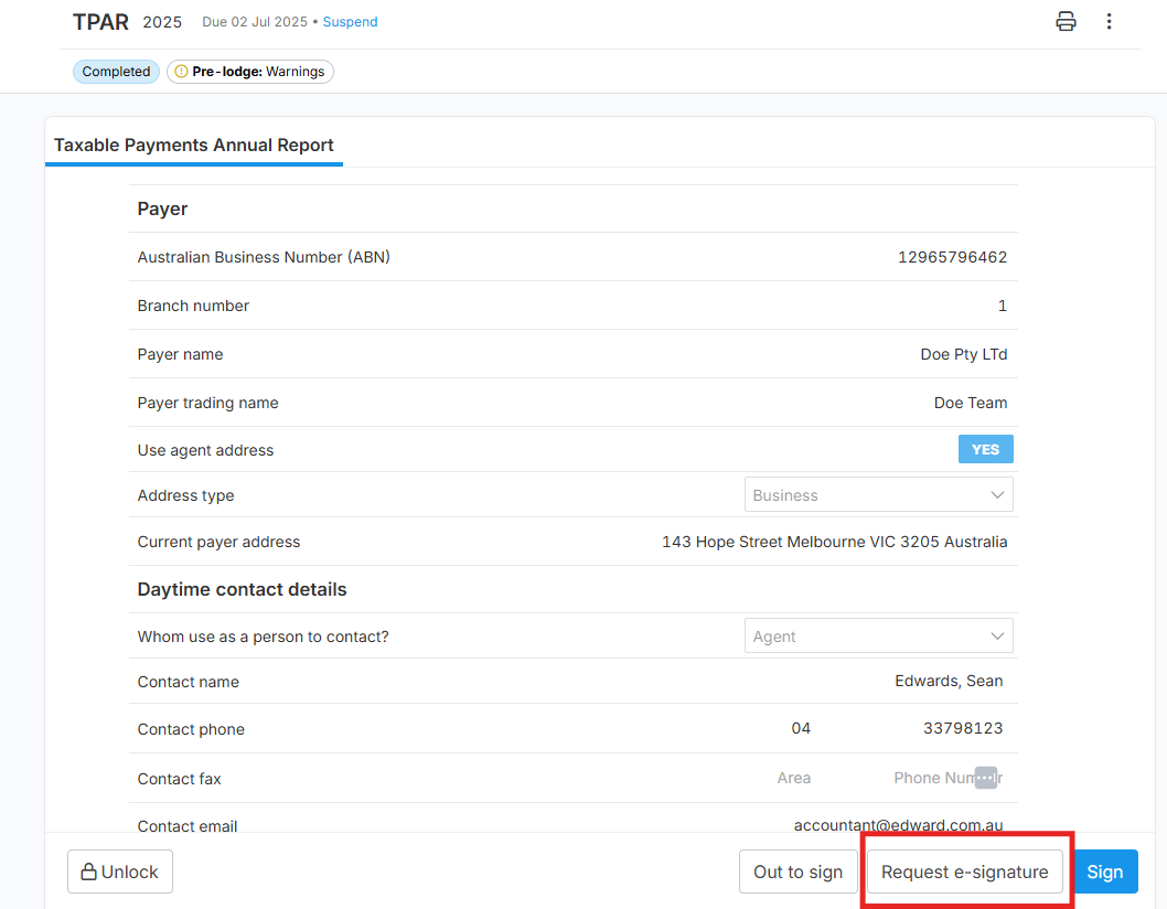 Note: LodgeiT uses signatory's contact details (via clients "Settings") to send e-signature. Learn more