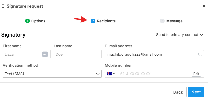 - The system remembers previous e-sign contacts and auto-populates details if the last request was sent to someone else.