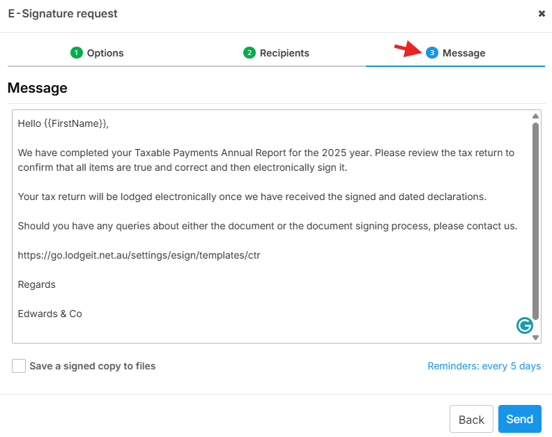 Tick the box of "Save signed copy to files" to automatically save signed documents in the client’s "Files" tab within LodgeiT.