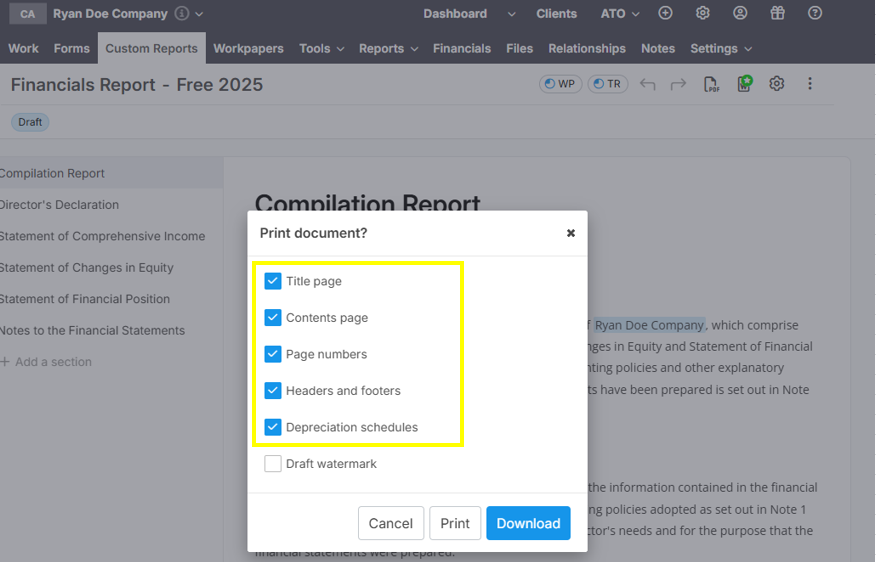 Lodgeit user will able to exclude: Title Page, Contents Page, Page Numbers and Headers/Footers and Depreciation Schedules (from Tools).