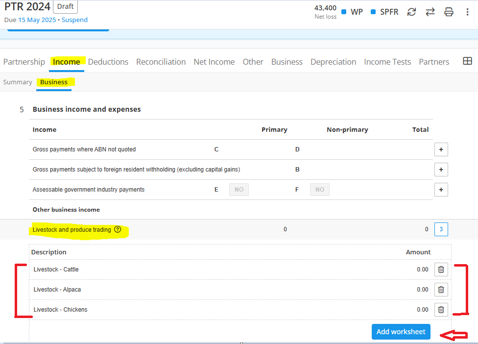 Scroll through "Other business income" item and add a worksheet using the plus (+) button.