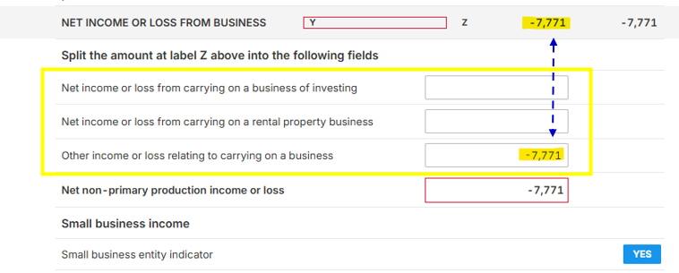 NOTE: If the amount in Label Z is negative (Net Loss) -7,771 , then you need to input a negative value as well in the applicable line item (3 items in yellow box below) for the split of label Z amount of -7,771.