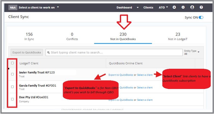 - This is uni-directional sync (operating in a single direction) i.e. LodgeiT --> 'QuickBooks Online' (because QuickBooks Online' doesn't share important details, such as entity type or ABN.There is no way for us to determinate if the entity is individual or not. If You think you have multiple clients to sync, best to send us your list excel/csv and we will help you migrate this to LdogeiT, then, you will turn on "Sync" feature in LodgeiT, so the system will automatically map clients. Other clients that have not been mapped the user should to map manually)Guide: Migrate and Sync Clients from Quickbooks and from Other Accounting System in a Single Account in LodgeiT