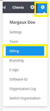 Top right of your LodgeiT interface, click "Gear wheel" and select "Billing"