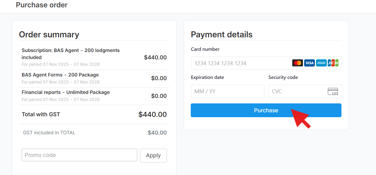 Once ready to purchase, set-up your bank details through "Payment Details", and press "Purchase" to proceed.