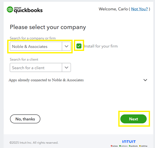 Note: Only tick check the "Install for your firm" when activating the QuickBooks Proadvisor Subscription (don't search and select a client)