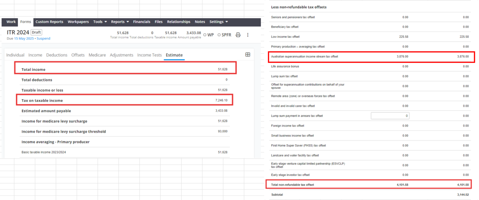 The client earned "Total Income" of $51,620, client has 7,246.10 tax to pay. And with an "Australian superannuation income stream tax offset" of $3,876 and Rebate of $4,101.58.