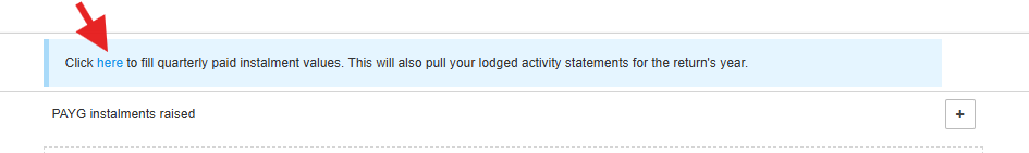 - In the "Tax Calculation" section, look for a light-blue rectangular box with the instruction: "Click here to fill quarterly paid instalment values. This will also pull your lodged activity statements for the return's year."