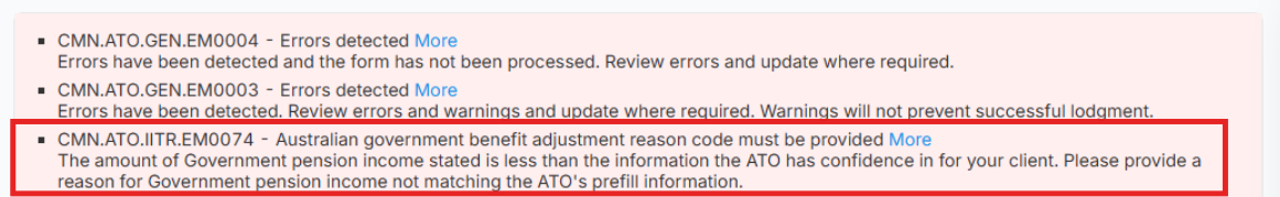 Error: CMN.ATO.IITR.EM0074 - Australian government benefit adjustment reason code must be provided.
