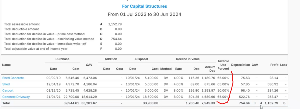 For example, in a report showing each asset’s partial use, according to the ATO’s Disposal of a depreciating asset , the portion of the sale attributable to taxable use is treated as Other income, while the non-taxable portion may be considered a capital gain.