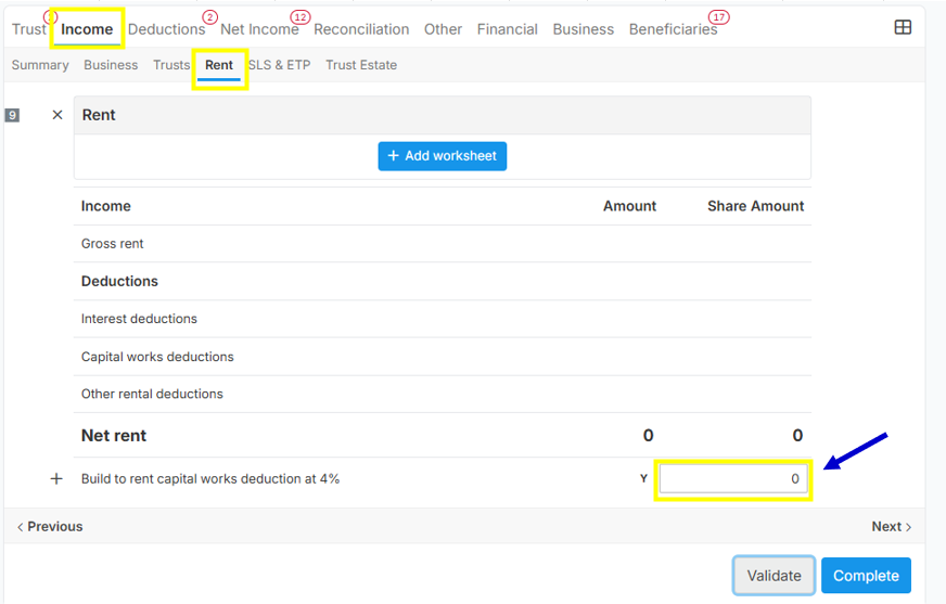 OR, you can also fix the error by inputting zero digit "0" under Label Y (Build to rent capital works deduction at 4%) in the Rent section. See below image for your reference: