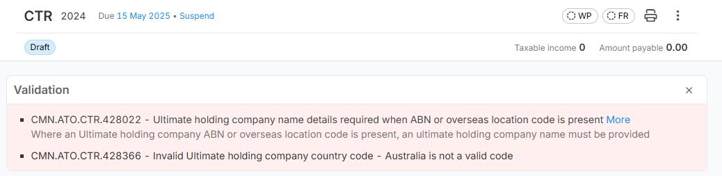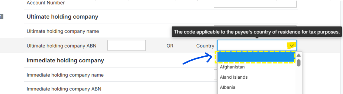 Go to Label 1 - "Ultimate holding company ABN OR Country" and ensure that no country is selected in the country field, by using the dropdown arrow.