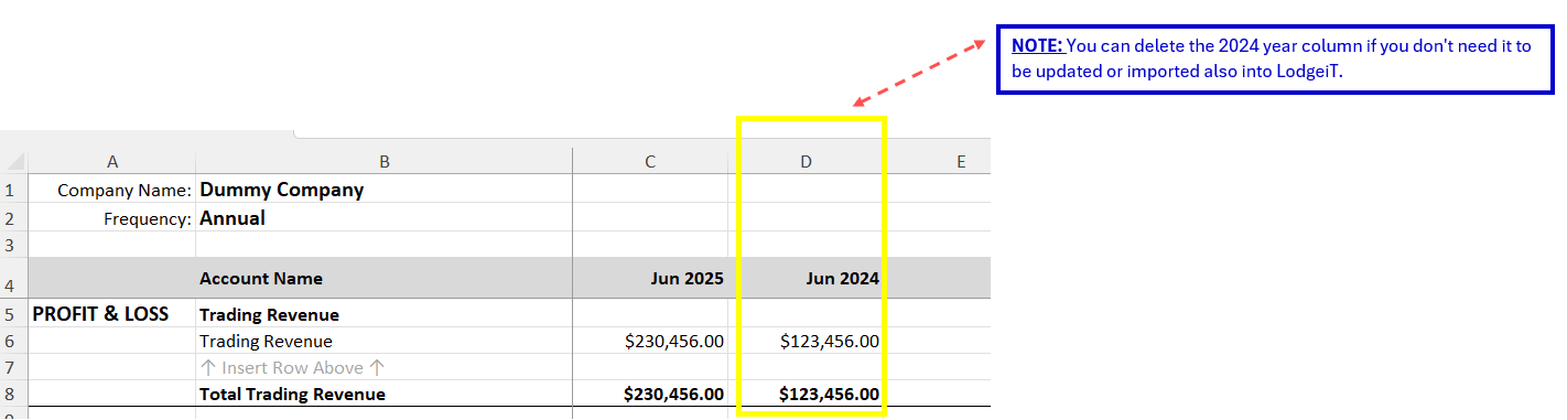 NOTE: You can delete the previous year amount, so that only one year data will be imported in LodgeiT. Please see below image for your refere