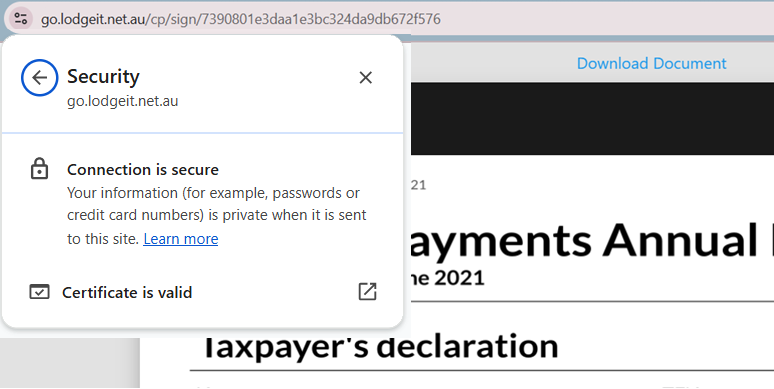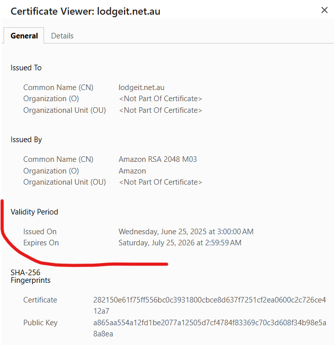 LodgeiT’s website uses a valid and secure certificate. You may check this through your browser’s certificate viewer.