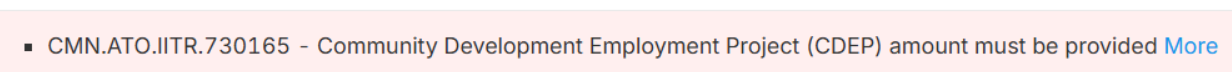 Error: CMN.ATO.IITR.730165 - Community Development Employment Project (CDEP) amount must be provided.