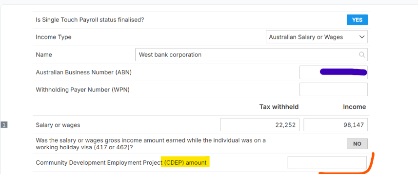 Guidance: The issue could be resolved by removing value from "Community Development Employment Project (CDEP) amount" field-