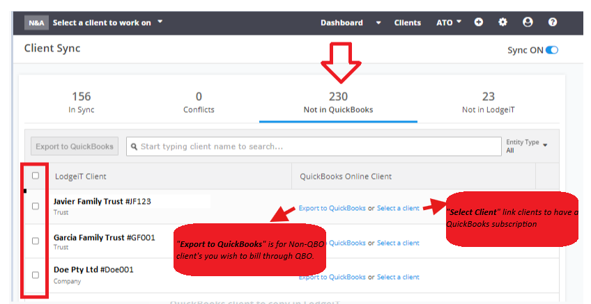 This same process applies to exports. LodgeiT organisations listed under the “Not In QuickBooks” tab have no automatically matched QBO entity and must be exported manually as needed.