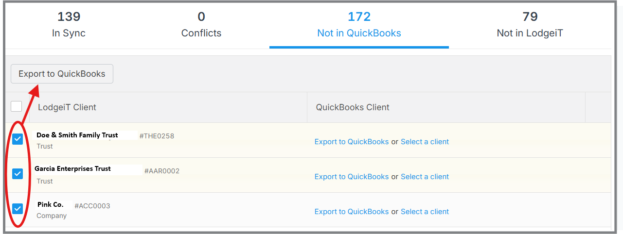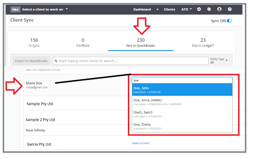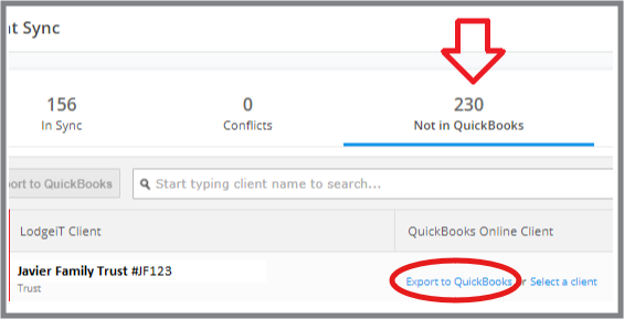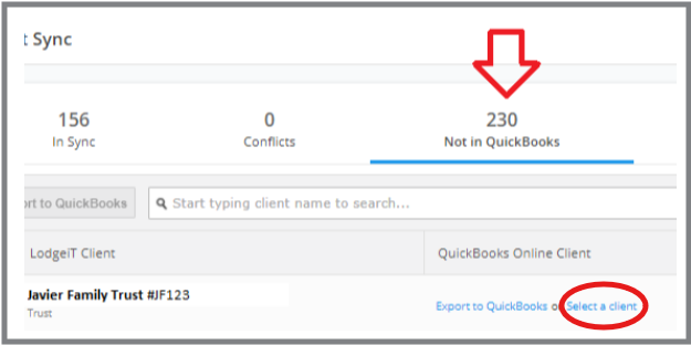Locate the LodgeiT client records you wish to sync back into QBO.