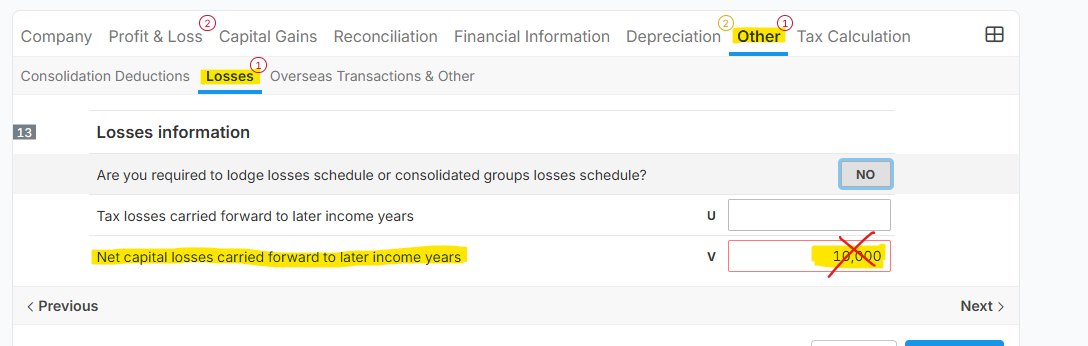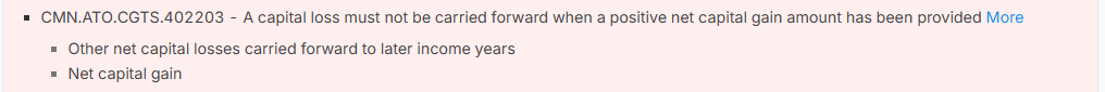 Error Prompt: CMN.ATO.CGTS.402203 - A capital loss must not be carried forward when a positive net capital gain amount has been provided: