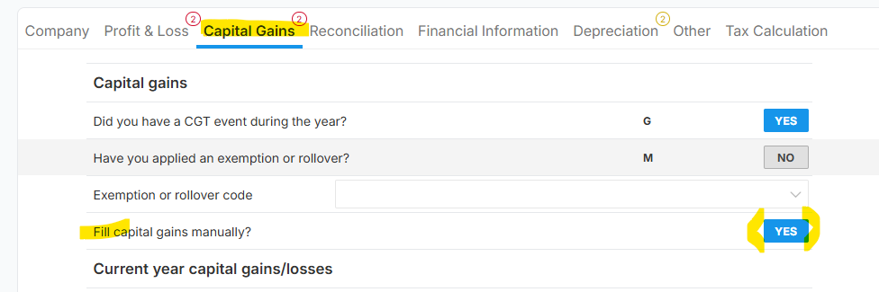 *Below image shows the Capital Gains section on which the question "Fill capital gains manually?" was selected as YES: