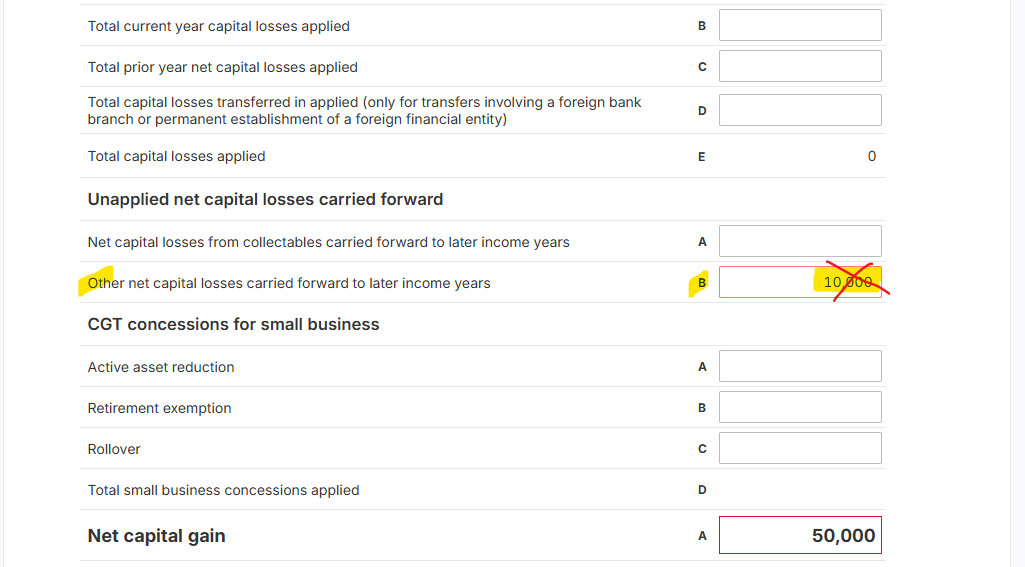 B. If you have chosen YES in the question "Fill capital gains manually?" in the Capital Gain schedule, then you need to also check if you have an amount in Item B - "Other net capital losses carried forward to later income years". If there is an amount, delete it if the Net Capital Gain is a positive value (below image shows a positive net capital gain of 50,000).