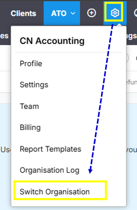 1. Click "Gear Wheel" button and then select "Switch Organisation".