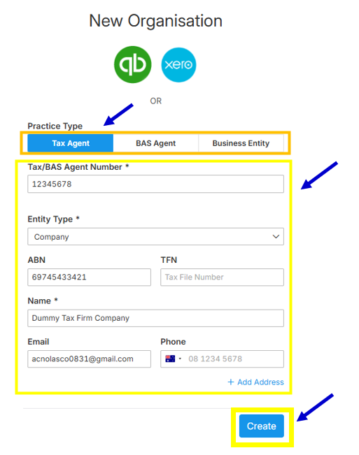 3. Fill-up the necessary details to create the new organisation, then click the "Create" button.