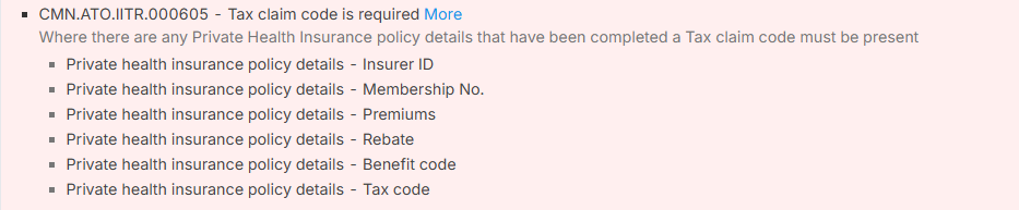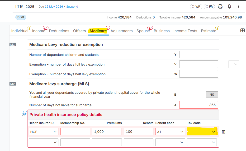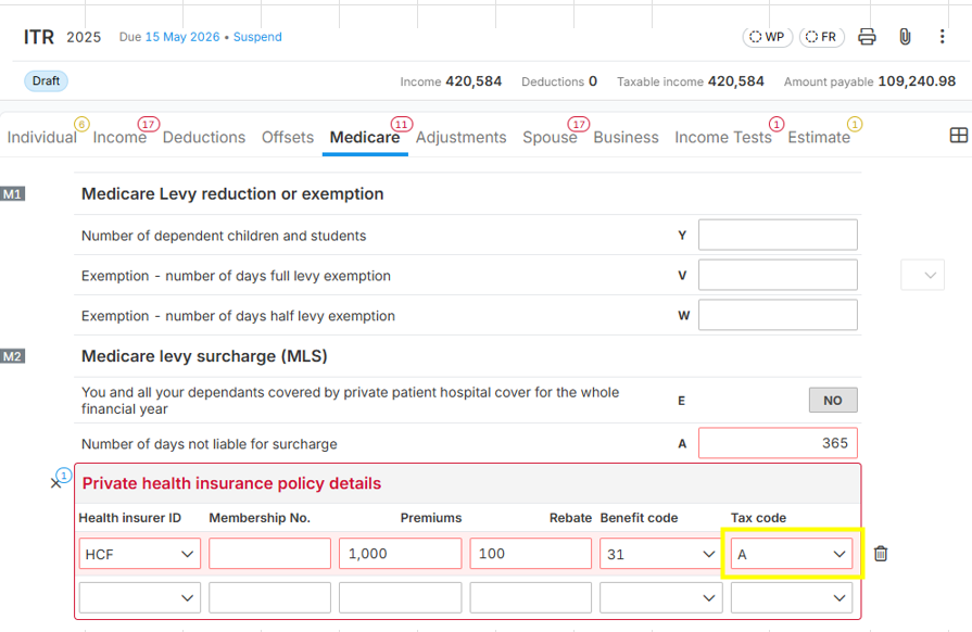 Suggested Solution: Go to Label M2 of the "Medicare" section, under "Private health insurance policy details", and select the appropriate "Tax Code".