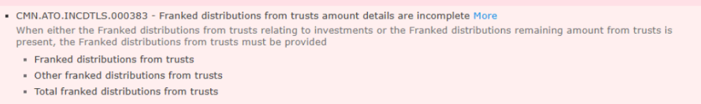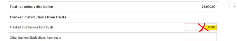 Please check all the trust worksheets and delete the zero digit input in the line item "Franked distributions from trusts":