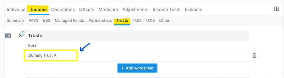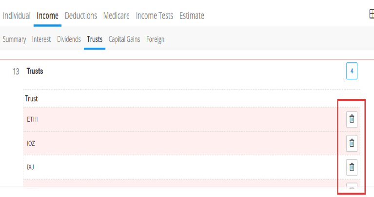 Note: In case there are trust worksheets which has no data and not needed in the tax form, please delete it also by clicking the trash bin icon on the right side of the worksheet. See below sample image for your reference: