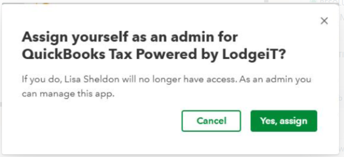 Prompt: "Assign yourself as an admin for QuickBooks Tax Powered by LodgeiT?"