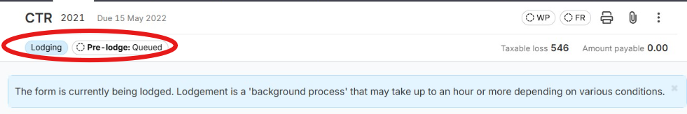 The “Lodging” status means that the form has not yet been successfully sent to the ATO and is still pending on the LodgeiT side.