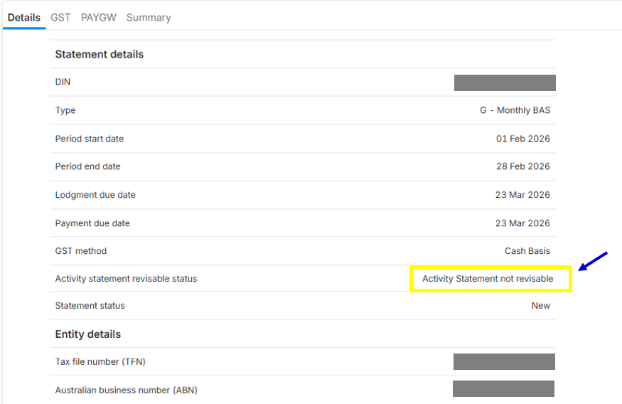 The term "Activity Statement not revisable" under the line item "Activity statement revisable status" in the activity statement is a prefill from ATO, which indicates that the activity statement cannot be revised or amended after it has been lodged. This status may apply due to specific circumstances, such as legislative restrictions, system settings, or the nature of the activity statement itself. If still in doubt, user need to contact ATO for further explanation