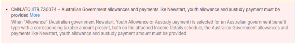 Error: CMN.ATO.IITR.730074 - Australian Government allowances and paymenys like Newstart, youth allowance and austudy payment must be provided.